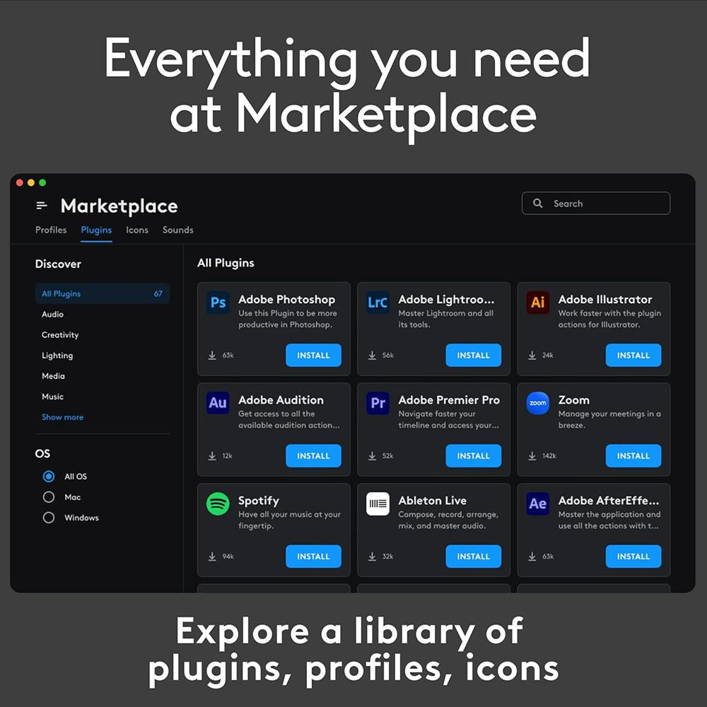 - Discover More on Marketplace - Find a growing library of actions and plugins; recommended profiles; icon packs; and more on the marketplace in the Logi Options+ app