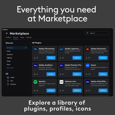 Find a growing library of free plugins; profiles; and more for you to try out through the marketplace on Logi Options+ App.