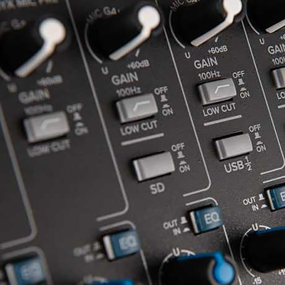 100Hz low-cut filter and 48V phantom power on all mic channels