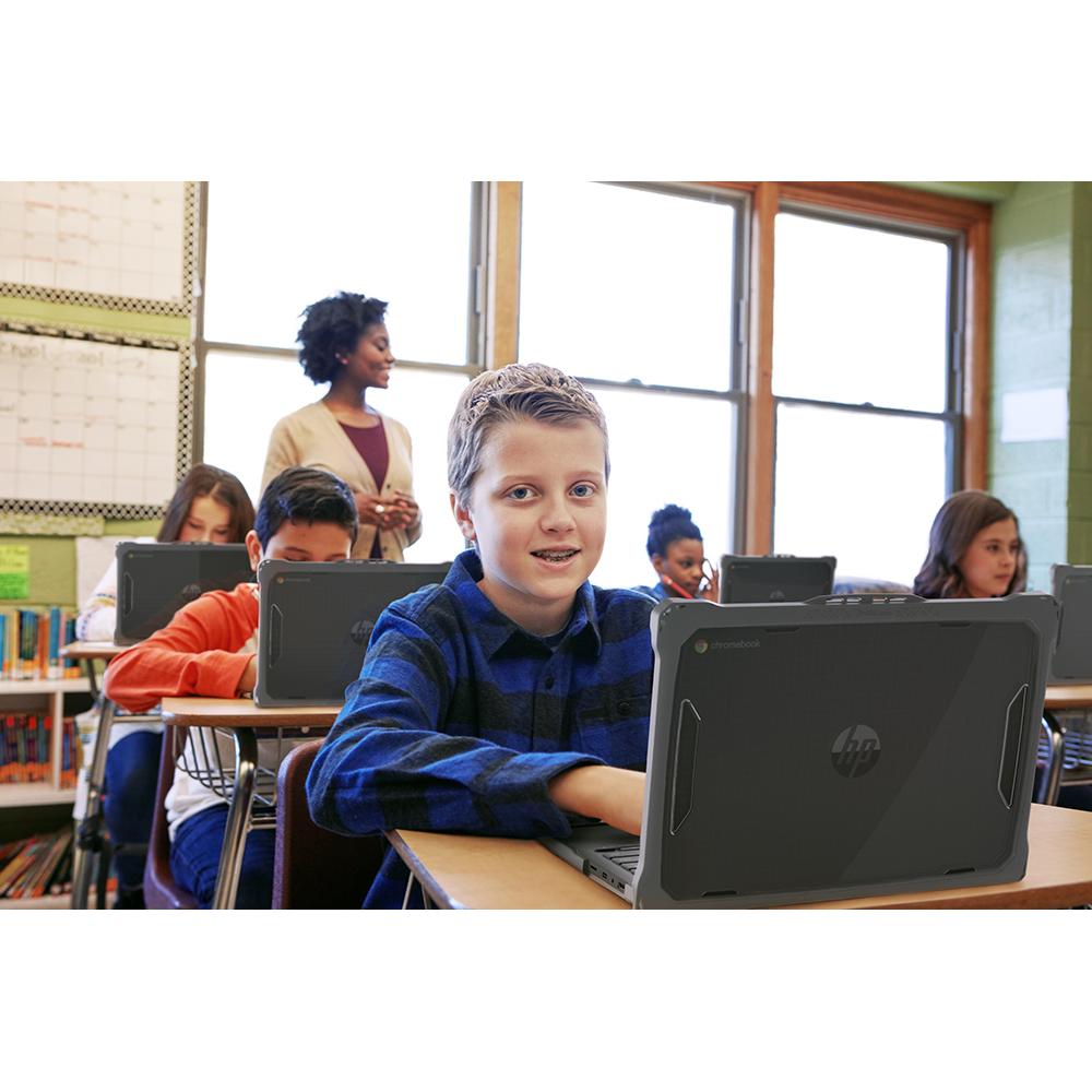 Featuring MAXCases' patented slide-on top design; the Extreme Shell-F Slide Case V2 protects Chromebooks with slide-on ease and enhanced screen protection in an updated; lightweight design. Featuring a refined top design; the Extreme Shell-F Slide Case V2 reduces carrying weight; without sacrificing durability or protection; while providing a sleek and easier-to-clean surface. The innovative slide design disperses pressure evenly around the entire perimeter; for a snug fit that eliminates pressure hotspots around the screen. Crafted with dual layers of tough TPU for outstanding impact and drop protection; the ESF2 case combines a cushioning inner layer of TPU with an oil- and dirt-resistant outer layer and is tested to meet MIL-STD 810H-516.6 for five-foot drops. The overhang corners add protection without added bulk; while the clear; rigid top and bottom panels prevent exterior damage and provide visibility for stickers and asset tags. The custom fit ensures easy access to all buttons and ports. For added convenience; the V2 design accommodates a handy carrying strap that fits snuggly against the case (sold separately).