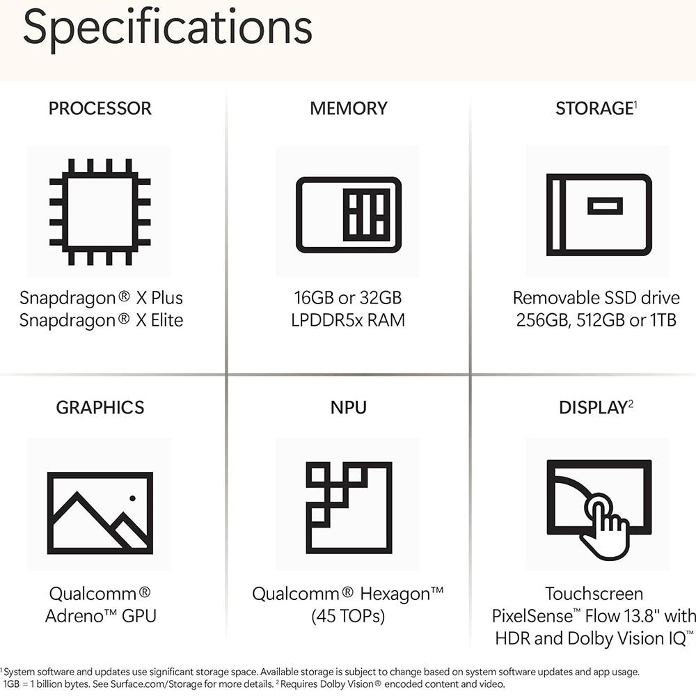 The new Surface Laptop is not just faster - it's smarter. Powered by Snapdragon X Elite and Plus processors with an industry leading NPU, the new Surface Laptop unlocks new levels of speed and all-new AI experiences that enhance productivity and creativity. Experience visuals like never before on its stunning touchscreen display with razor-thin bezels. This light and stylish laptop delivers exceptionally long battery life, ultimate typing comfort now with a haptic touchpad, and a full HD Surface Studio Camera.