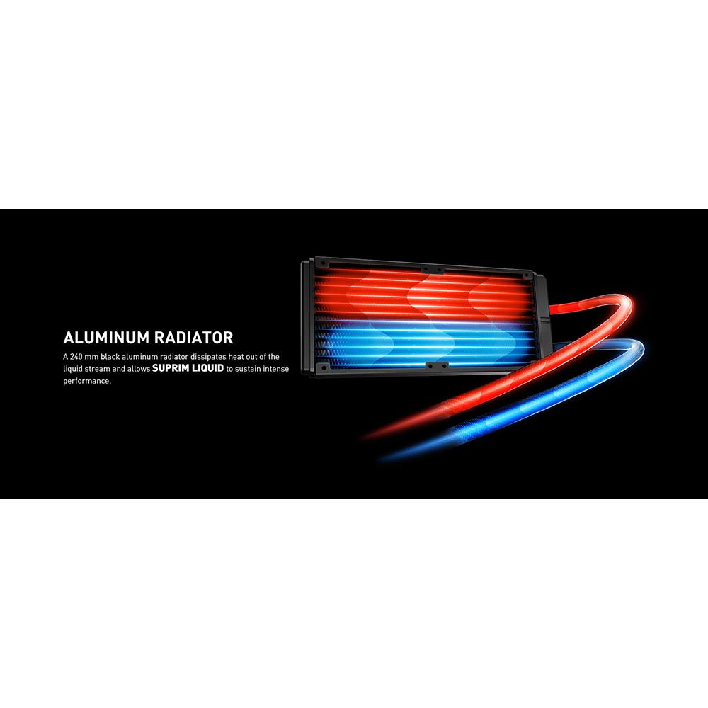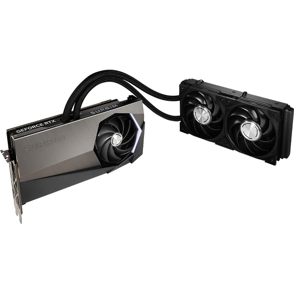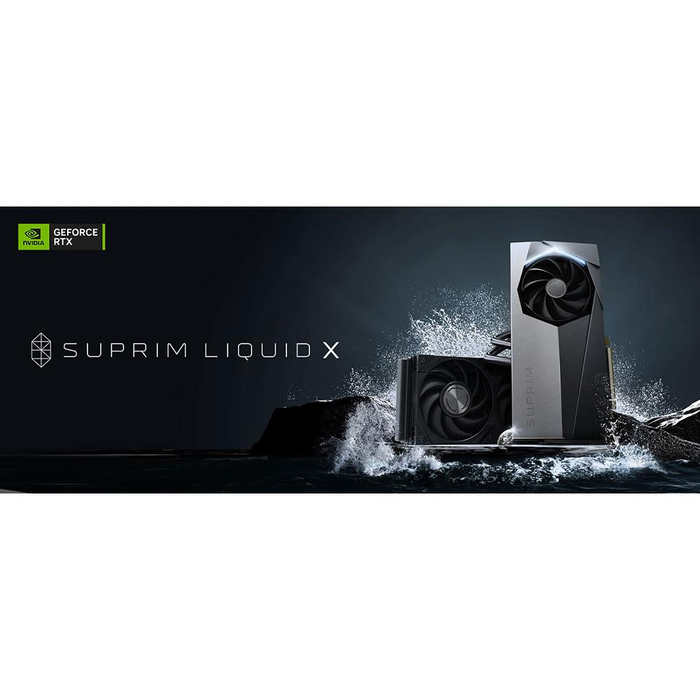 GeForce RTX 4090 SUPRIM LIQUID X 24G applies a closed-loop liquid cooling system that keeps temperatures even lower to allow new levels of performance. The 240 mm aluminum radiator is cooled by a pair of MSI Silent Gale P12 120 mm fans, designed to provide massive air pressure at extremely low noise. Zero Frozr keeps fans still and maintains silence until cooling is needed. The copper coldplate with internal micro-fin design draws heat directly from the GPU into the circulating coolant. Dual BIOS gives you the choice to prioritize for full performance in GAMING mode or low noise in SILENT mode. Exclusive MSI Center software lets you monitor, tweak and optimize MSI products in real time.