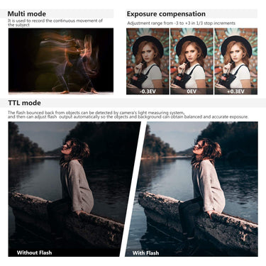 - Flash mode: TTL, M, MULTI, S1/S2 mode