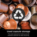 The used capsule storage bin holds up to 20 capsules for easy recycling.