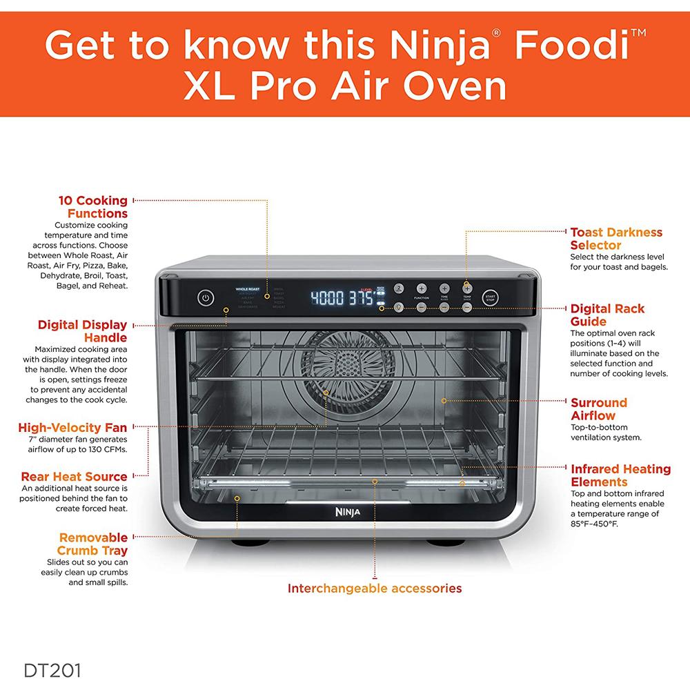 - Meet the Ninja Foodi XL Pro Air Oven, the extra-large toaster oven and air fry oven with True Surround Convection. You get up to 10X the convection power of a traditional full-size convection oven, so you can make quick family meals on 2 levels.