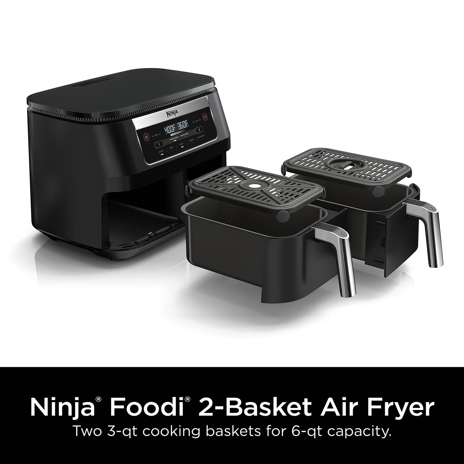 The Ninja™ Foodi® 5-in-1, 6-qt. 2-Basket Air Fryer with DualZone™ Technology lets you cook 2 foods in 2 independent baskets at once—not back-to-back like a traditional single-basket air fryer. DualZone™ Technology's Smart Finish™ feature intelligently manages cooking so both foods finish at the same time. With 6-qt capacity, its perfect for quick snacks or small meals.
