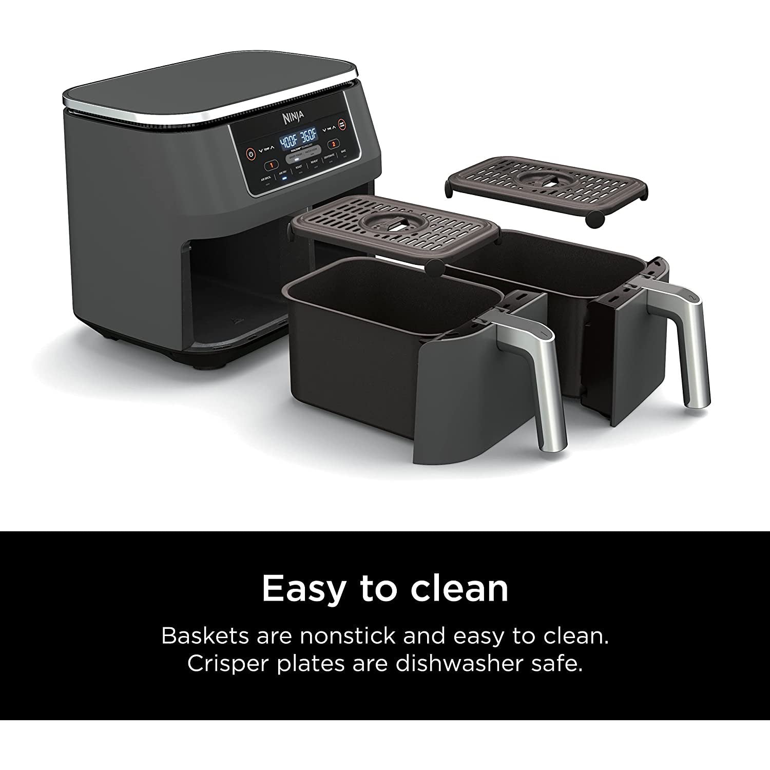 Two baskets are nonstick and easy to clean. Crisper plates are dishwasher safe.