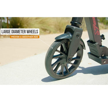 Comfort and style - An extra-large, 8” (200 mm) urethane front wheel and abrasion-resistant, airless rear tire smooth the road so you can travel in total comfort, while a patent-pending, anti-rattle folding mechanism provides a quieter ride.