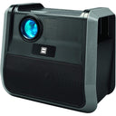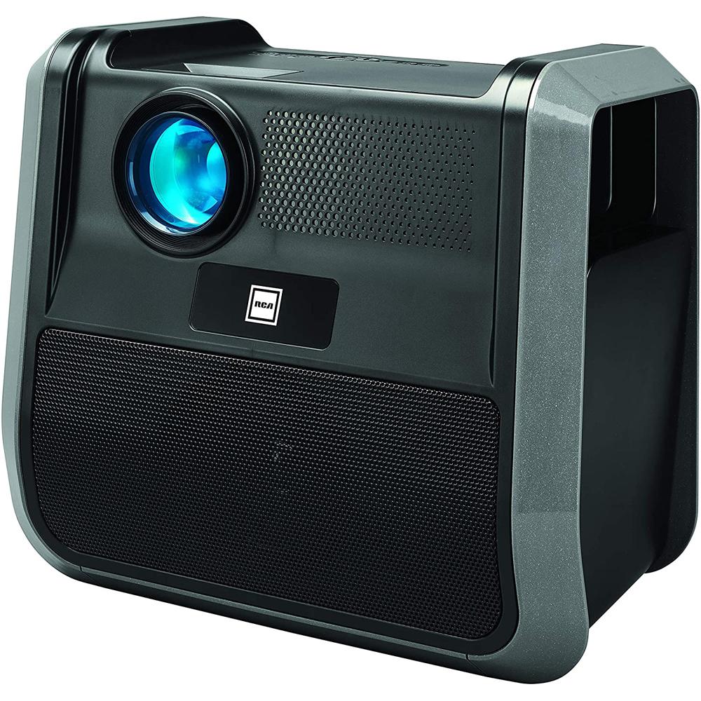 Portable home theatre projector for both outdoors and indoors. Use on a projector screen or even on the wall or side of house. Built-in rechargeable battery and large backfiring speaker focuses the sound to the viewers. Remote control allows controlling the functions from your seat.