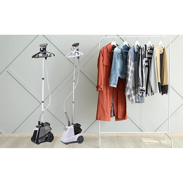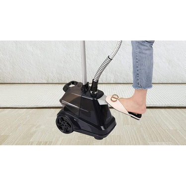 The SALAV X3A Commercial Full-Sized Garment Steamer is the latest in steamer technology from SALAV. It has an improved boiler system and a powerful 1800 Watts of steam that is great for both residential and commercial use. The extra large 3 liter capacity water tank allows an hour and a half's worth of steam time; and the foot pedal power control is a very convenient way in turning the unit on. It also features a dual-insulated woven hose with a brass connector; and a heavy duty aluminum plated steam nozzle. The 360 degrees swivel hanger with hanger clips is also great in securing up to 6 garments at the same time.
