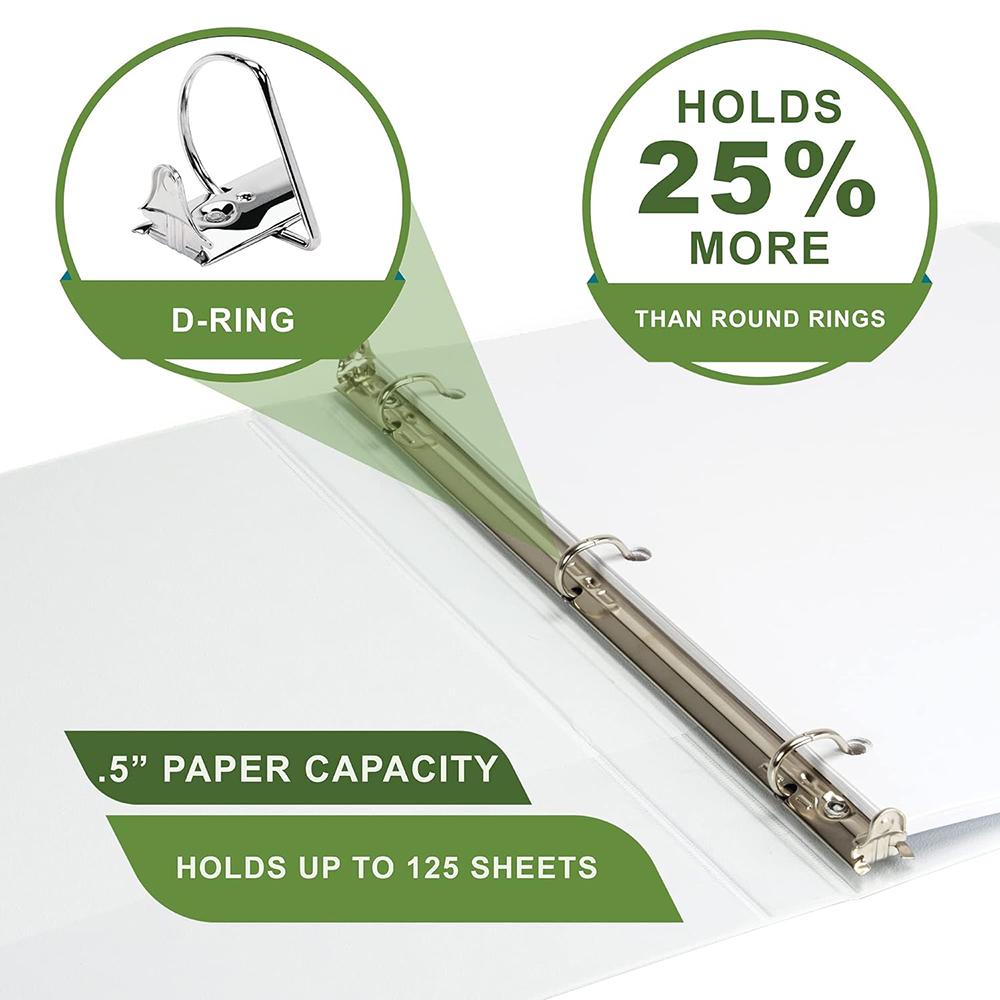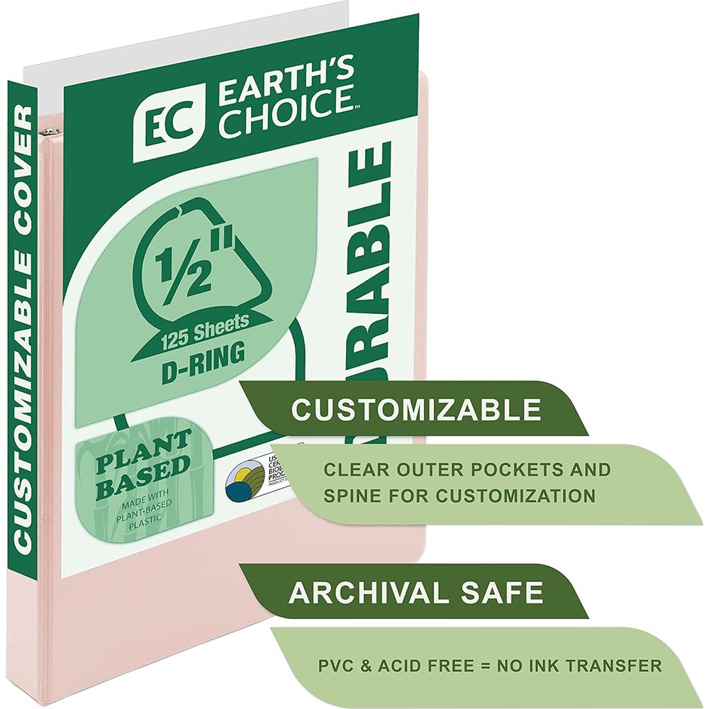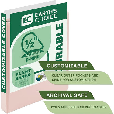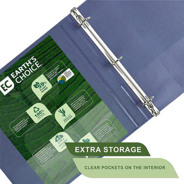 Earth's Choice plant-based 3-ring binder set offers the sustainable organization you've been searching for. These binders are made of at least 59% biobased material and come with a cover made with up to 25% plant-based renewable plastic. The durable chipboard is made from 100% recycled material and a minimum of 98% post-consumer content. Plant-based content is carefully tested using ASTM D-6866 standards. Each important document binder features a clear overlay along the front, back, and spine, allowing you to customize your presentations, projects, and more. A non-stick polypropylene cover adds durability and effectively prevents the transfer of ink or lifting of copy when materials are inserted into the cover or placed inside. The rings are mounted on the back lid, allowing pages to lay flat while also preventing wear and tear on documents. 2 clear interior pockets provide additional storage with enough space for notes, photos, business cards, or full-size pages. Get crafty and create a baseball card binder, portfolio binder, recipe binder, trading card binder, savings binder, etc. The possibilities are endless!