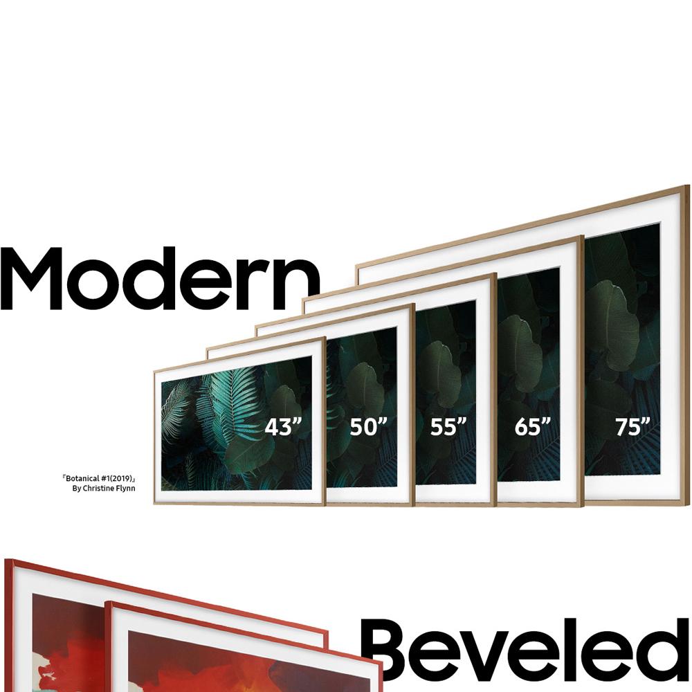 Modern bezels are compatible with 43-75" The Frame TVs. Beveled bezels are compatible with 65" and 55" The Frame TVs.