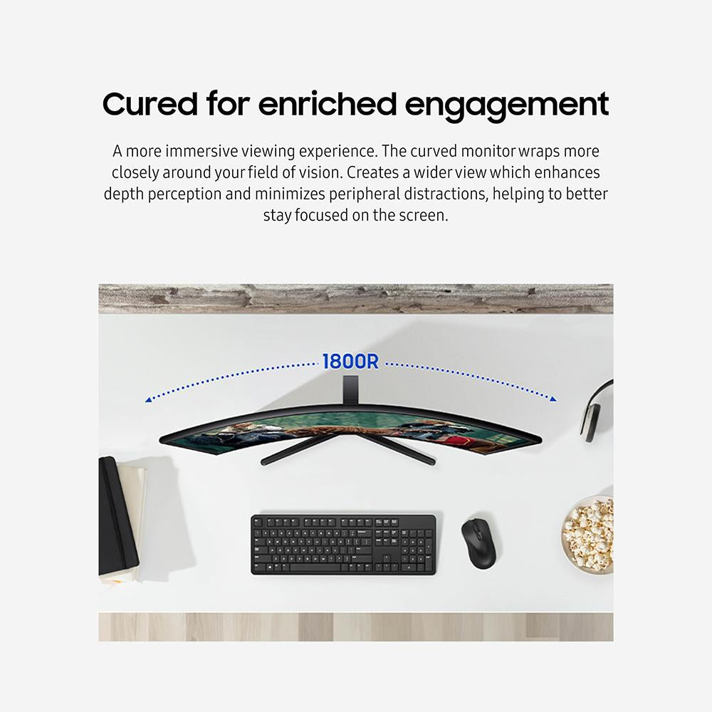 A more immersive viewing experience. The curved monitor wraps more closely around your field of vision. This creates a wider view which enhances depth perception and minimizes peripheral distractions, helping to better stay focused on the screen.