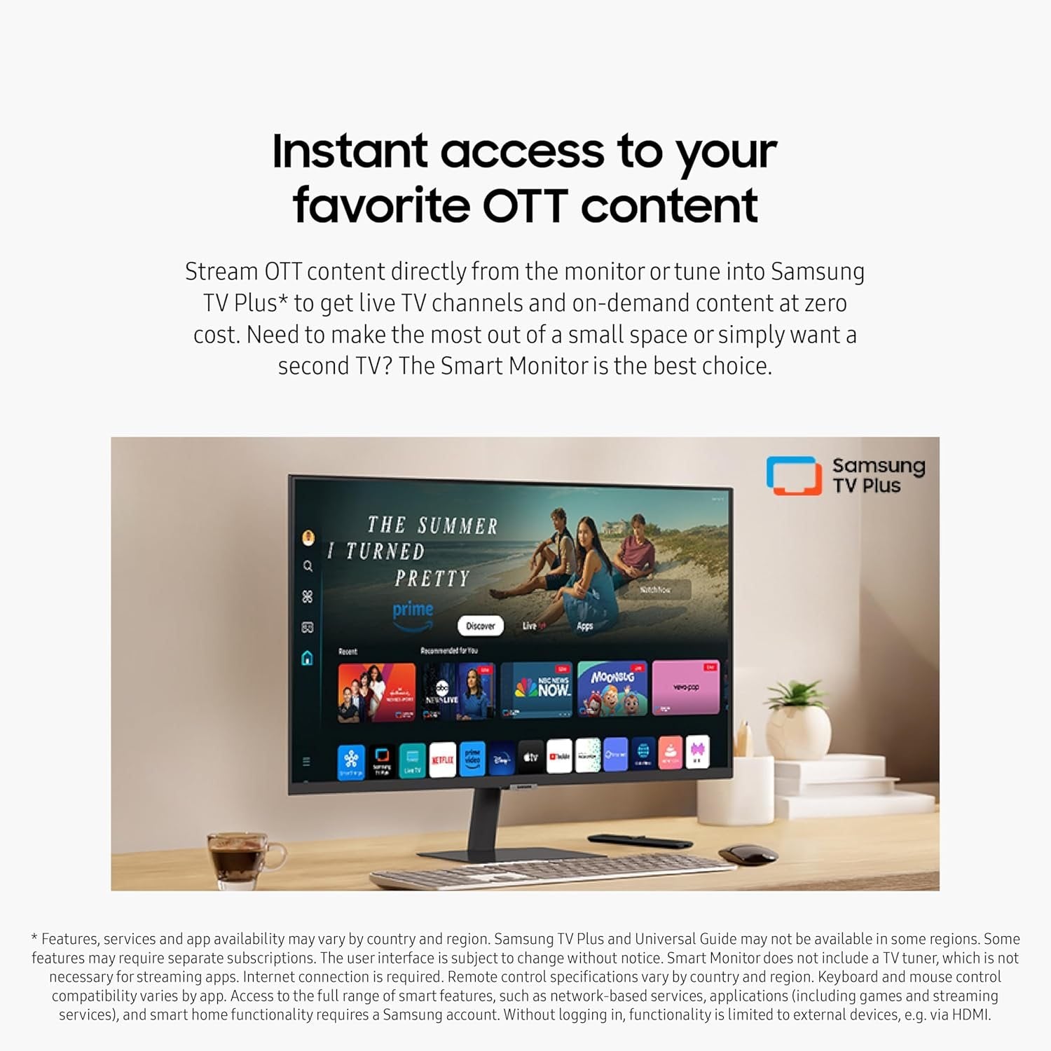 Stream OTT content directly from the monitor or tune into Samsung TV Plus to get live TV channels and on-demand content at zero cost. Need to make the most out of a small space or simply want a second TV? The Smart Monitor is the best choice.
