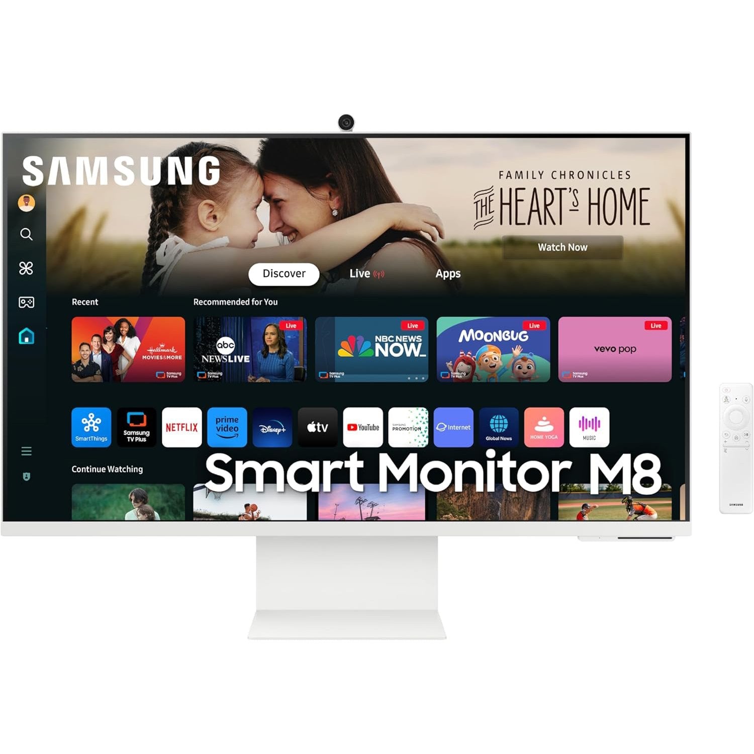 Samsung’s 32" Smart Monitor M8 (M80D) is an all-in-one streaming TV and desktop monitor powered by AI. Stream content directly from the monitor or tune into live TV channels. Maximize your multitasking using a single mouse and keyboard across devices. 4K UHD resolution & HDR10+ support brings content to life and creates brighter brights and darker darks. AI upscaling transforms lower resolution content to nearly 4K with new levels of definition. Iconic slim-design with height-adjustable stand ensures maximum viewing comfort, and multiple ports, including USB-C, eliminates the need for adapters. Samsung Gaming Hub allows instant gameplay, and AVA Pro allows you to hear every word without distractions. Control with SolarCell Remote and use SmartThings IoT hub as an easy way to manage devices in different rooms
