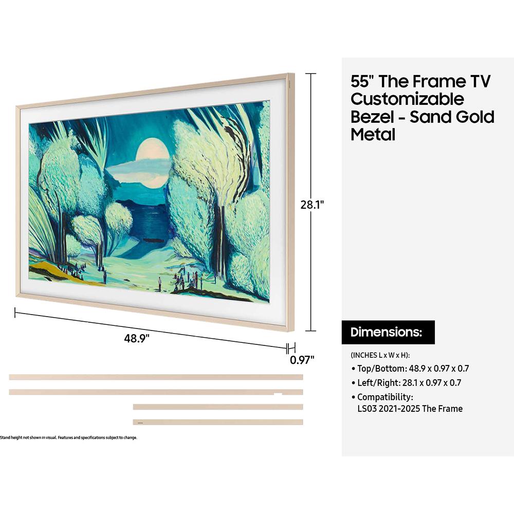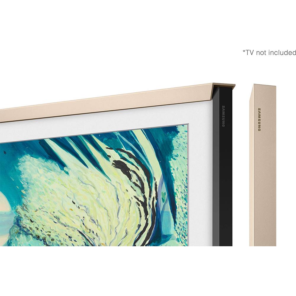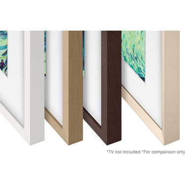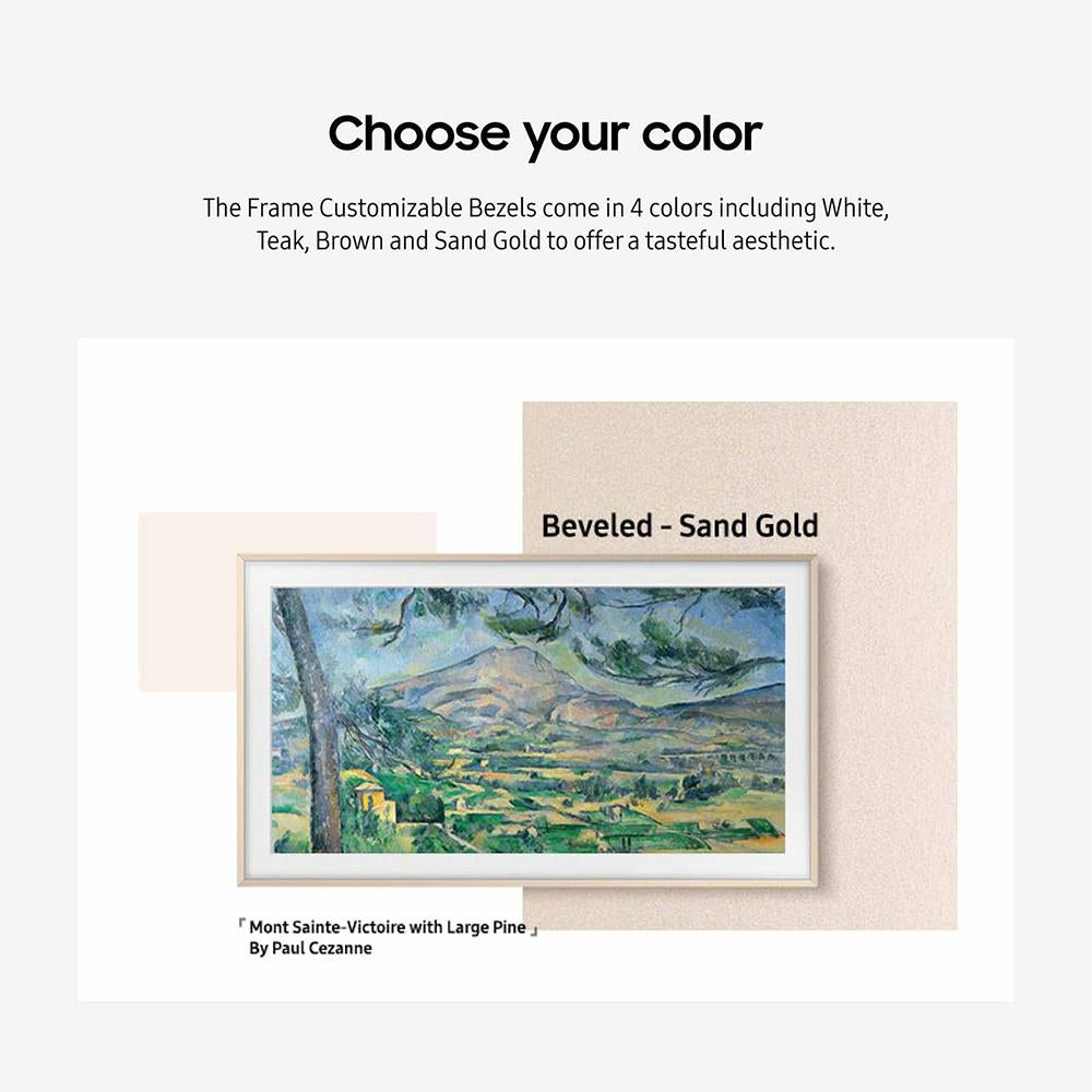Express your style — even with your TV. The Frame Customizable Bezels come in 4 colors including White, Teak, Brown and Sand Gold to offer a tasteful aesthetic. Refresh The Frame's aesthetics in a snap. Simply pop on the bezel of your choice for a quick change. Find the color and a silhouette that works for you. White, teak, or brown in the modern option for a simple profile, or the sand gold metal in the beveled silhouette for a premium touch. Each customizable bezel fits The Frame seamlessly, accentuating its sleek, clean lines and crisp angles. Just pick the finish that best suits your style. *2023 55" customizable bezels are compatible with 2023 55" The Frame TV; not compatible with earlier TV models.