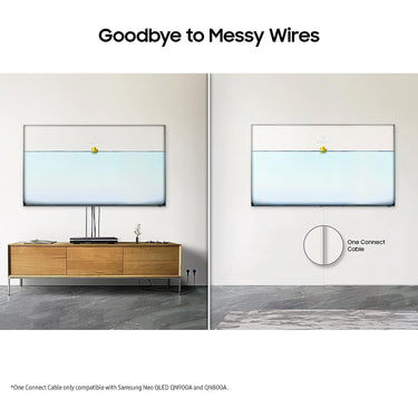 Minimize clutter with the Samsung One Connect Cable for Neo QLED TV; Use a single cable that connects your television to multiple sources including the power cable; The result is a seamless surface that blends perfectly into your home design. Rediscover lost space and reimagine how your home looks when you connect your devices to the Slim One Connect Box using the five-meter One Connect Cable. When you hide all your connections with the One Connect Cable and tuck away your devices, the results are transformational