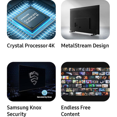 Upgrade your home theater with this stylish 4K TV featuring vibrant colors, rich contrast and an advanced 4K processor. Stay endlessly entertained with thousands of ondemand shows and movies for free and enjoy peace of mind as watch thanks to our proprietary triple-layer security that protects your personal data across all connected devices at once. With elegant metal housing, this essential 4K TV delivers an element of style along with a crisp and vibrant picture. Take advantage of more than 2700 free channels on Samsung TV PlusÂ