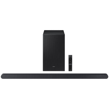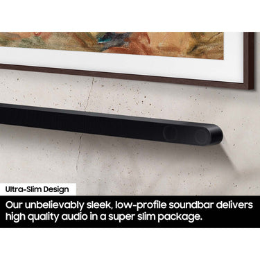 This slim, stylish Samsung Soundbar offers high-quality audio in a compact package. It pairs with Samsung TVs for powerful audio experiences. It also comes equipped with the Wireless Dolby Atmos technology that eliminates HDMI cables, providing immersive sound for your favorite shows, music, and movies while remaining aesthetically pleasing.