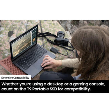 Introducing the Samsung T9 4TB Portable SSD, your ultimate storage solution that doesn't just keep up but sets new speed benchmarks. With sustained read and write speeds of up to 2,000MB/s, it ensures that your workloads, from loading and editing to transferring, are handled with unprecedented speed. This SSD boasts an advanced thermal solution to stay cool under the most intense deadlines, guaranteeing optimal performance without overheating. Its extensive compatibility makes it a versatile companion for desktops, gaming consoles, and beyond, offering a substantial 4TB capacity to safely store all your creative projects. Engineered for the demands of heavy-duty use, the T9 Portable SSD combines extreme performance with robust reliability. Stay up-to-date and secure with Samsung's Magician Software, ensuring your drive performs at its best while providing AES 256-bit hardware encryption for your data.