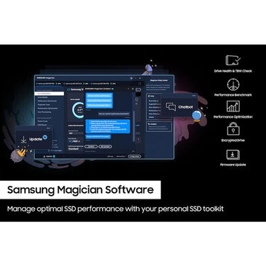 - Samsung Magician Software enhances SSD functionality with drive health monitoring, data protection, and firmware updates.