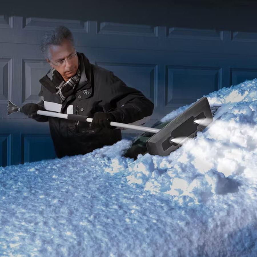 A revolutionary 4-in-1 device, this snow broom is also an ice scraper, flashlight, and emergency blinker all in one convenient and compact tool. Now you can safely sweep snow and scrape ice off your car day or night, without damaging its paint, trim, or glass. And the telescoping pole extends from 33 to 52 inches to easily access the snow piled on top of your carās roof or trunk. Four powerful LED lights instantly brighten your task, and the built-in blinker doubles as an emergency flasher when you really need to be noticed. Plus, Illum-n-broom stows neatly inside your car, so itās always ready when you need it. Just sweep, scrape, and illuminate!