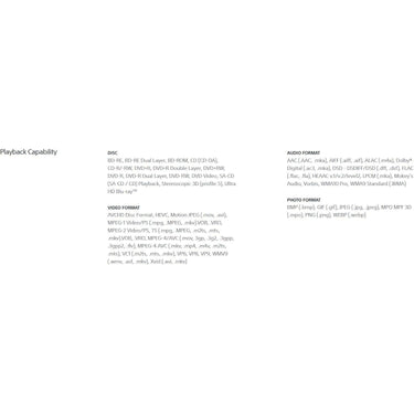 | STEP Playback (FWD/REV): Yes (Step REV is supported only for BD-ROM(2D), BDAV, DVD-ROM and AVCHD) |