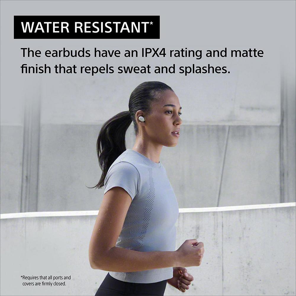 The earbuds have an IPX4 rating and matte finish that repels sweat and splashes so you can train, commute, and unwind with confidence. Note: Splash-resistance applies only to the earbudâs main unit; the charging case is not water-resistant.