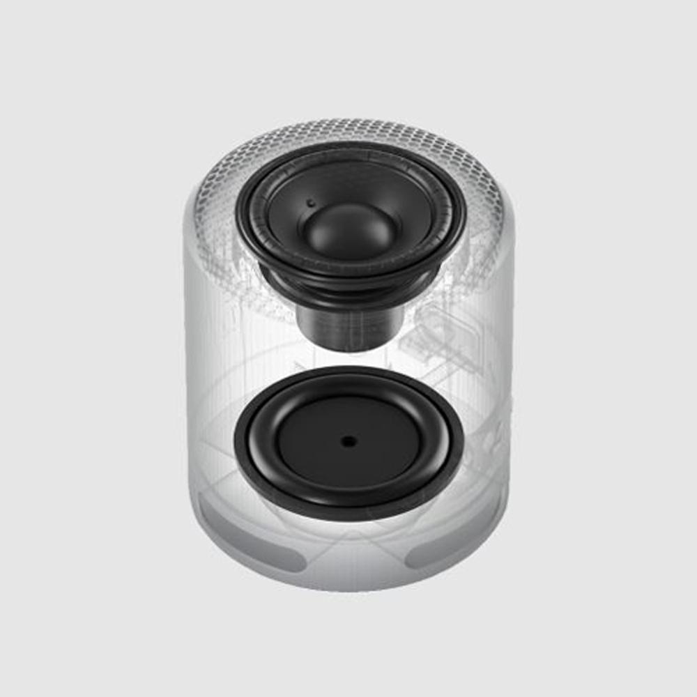 A passive radiator works together with a full-range speaker to enhance low-end tones, giving bass a boost.
