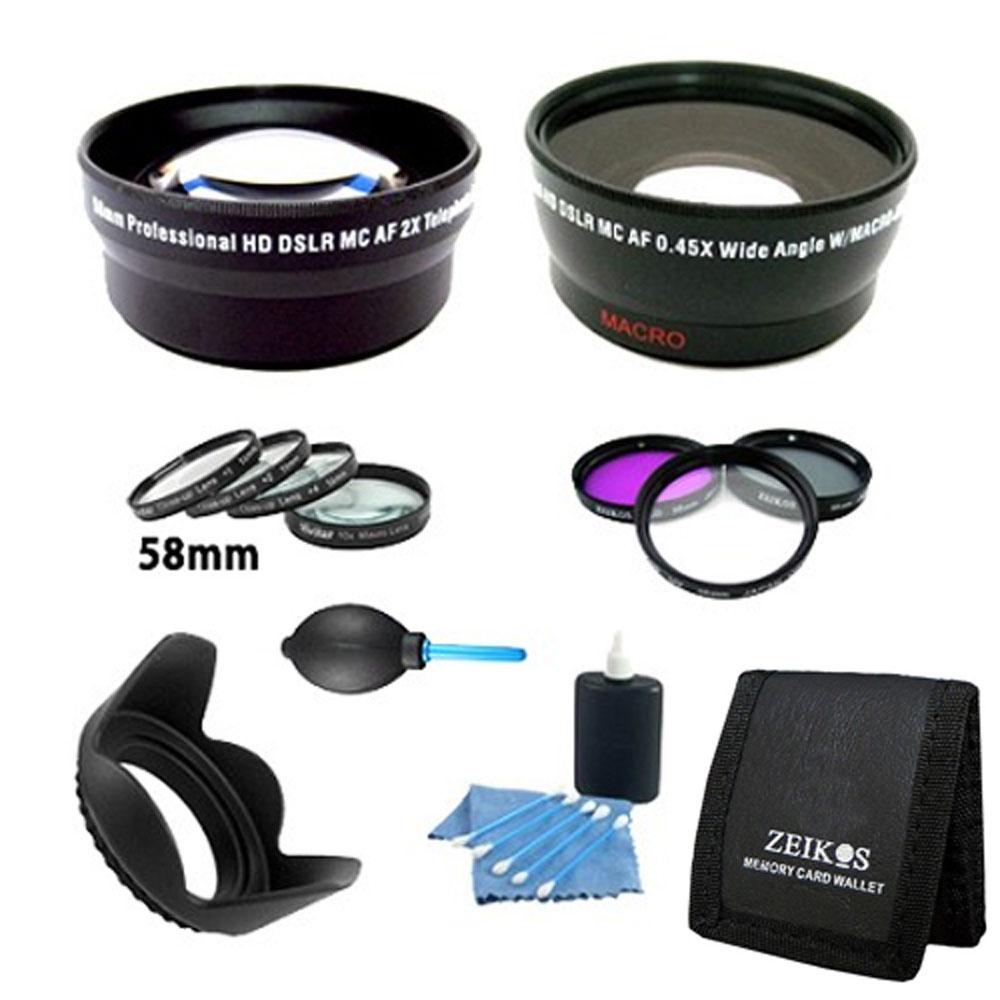 - Kit includes: 58mm Wide Angle & Telephoto Lens, Macro Close Up Set, Filter Kit , Dust Blower, Tulip Flower Lens Hood, Cleaning Kit, Memory Card Wallet