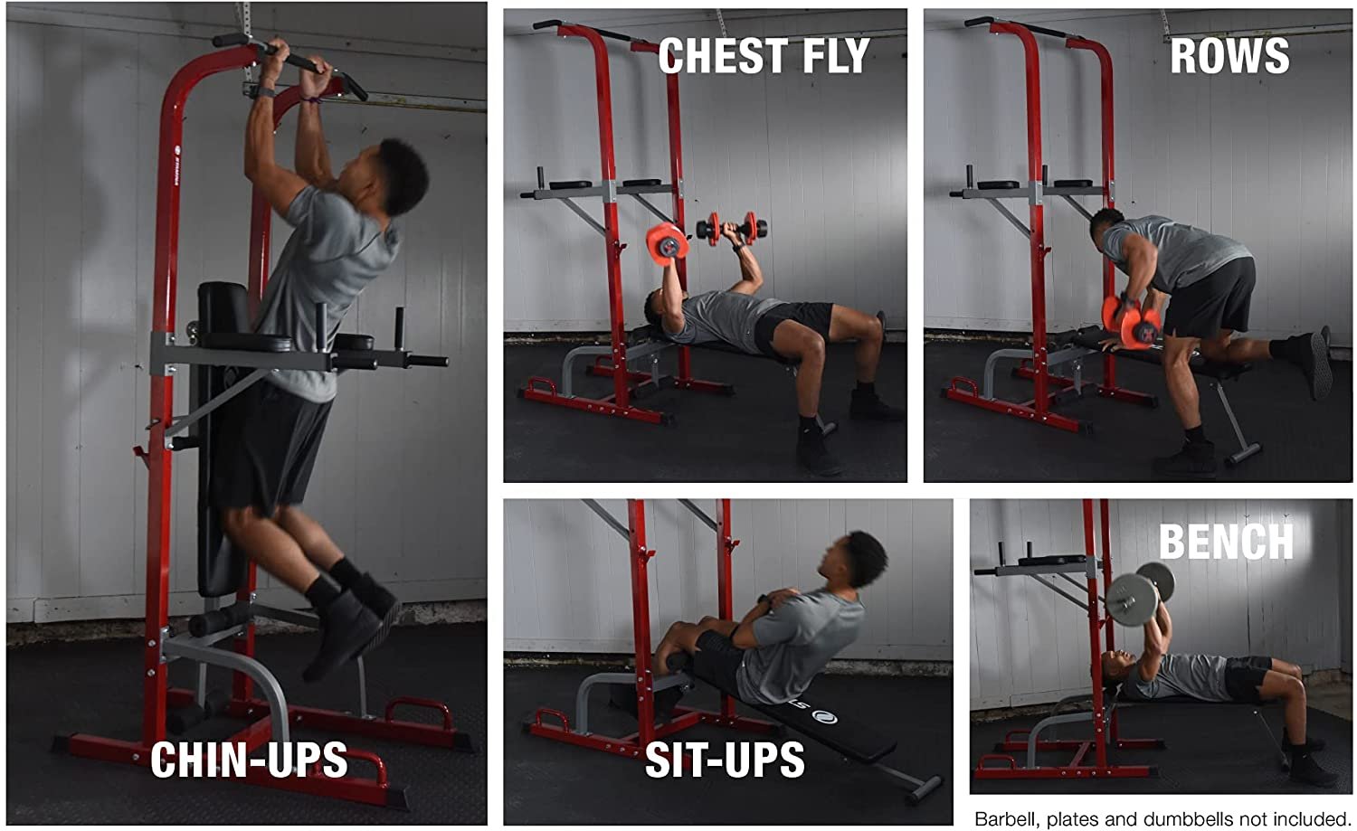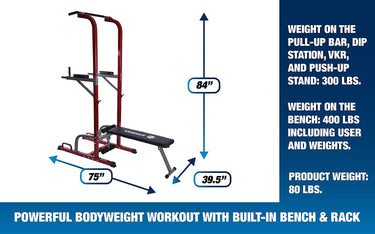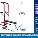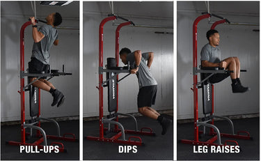 The solid steel frame and bold, red design make the Power Tower a centerpiece in any home gym. When you're done using the bench, fold it up onto the Tower to save space.