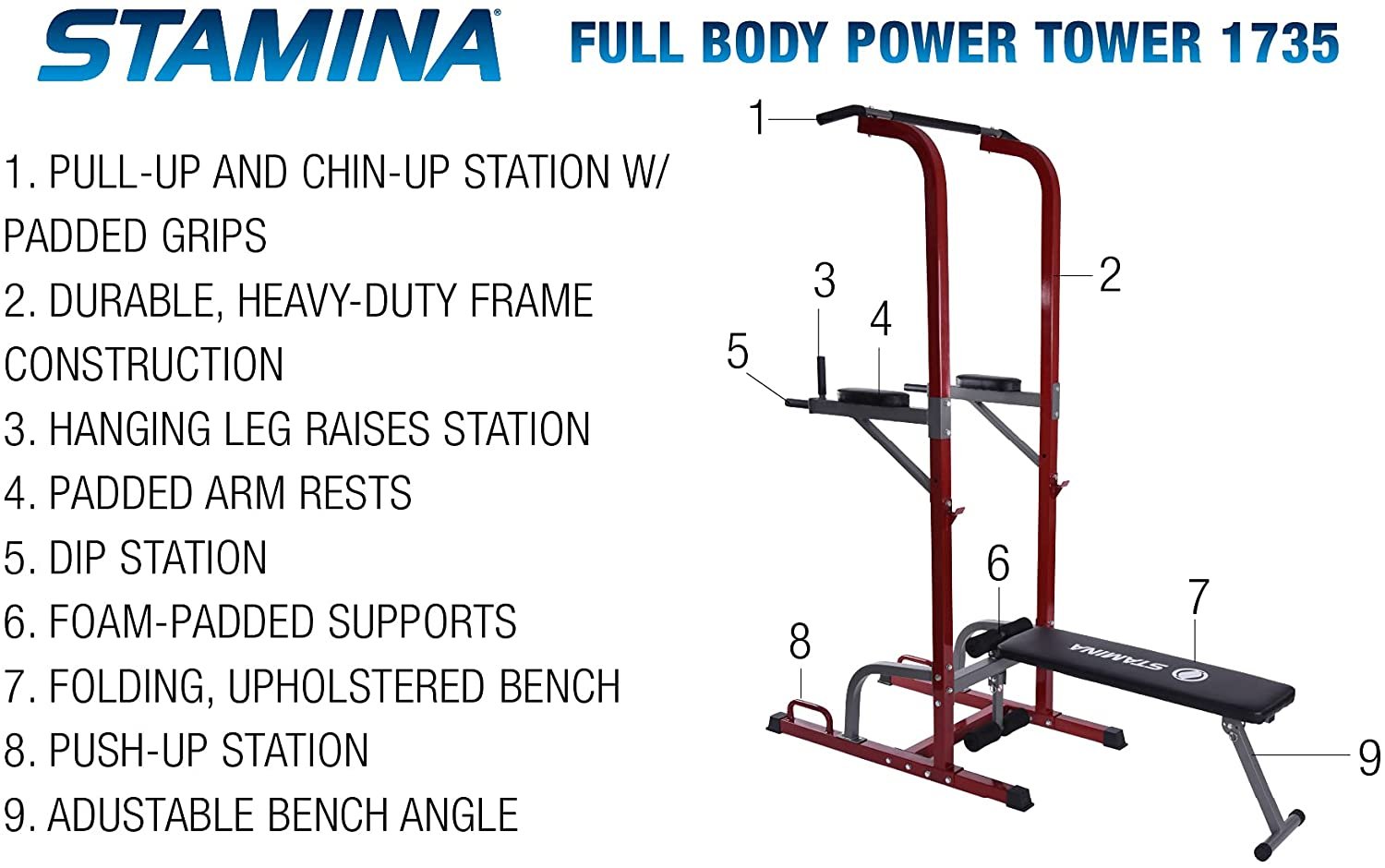 The Stamina Full Body Power Tower 735 provides a powerful bodyweight workout outlet on one piece of equipment. No matter what your fitness goal is, the Stamina Full Body Power Tower will help. Multiple exercise configurations make this an all-in-one home gym centerpiece.