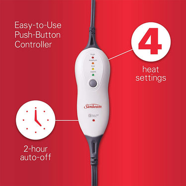 This Sunbeam Premium XXL-Size Heating Pad with Compact Storage delivers soothing heat therapy for common muscle and joint pain. The 20 x 24-inch flexible, plush pad is 60% larger than Standard-Size Sunbeam Heating Pads, for full coverage of large muscle groups such as the entire back and legs, and can help accelerate tissue healing and relax sore muscles associated with muscle tension and stress. Customize treatment with 4 different heat settings and 2-hour auto-shutoff. After heat therapy treatment, roll up controller in pad and secure in place with elastic straps for neat storage. Enjoy convenient features such as an easy-to-use push-button controller with LED heat-setting lights for visibility in the dark, and a long 9-foot cord. For optional moist heat therapy, spray fabric with water for deep, penetrating pain relief. The entire flexible, plush hot pad is fully machine washable for easy care; just disconnect the controller.