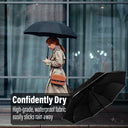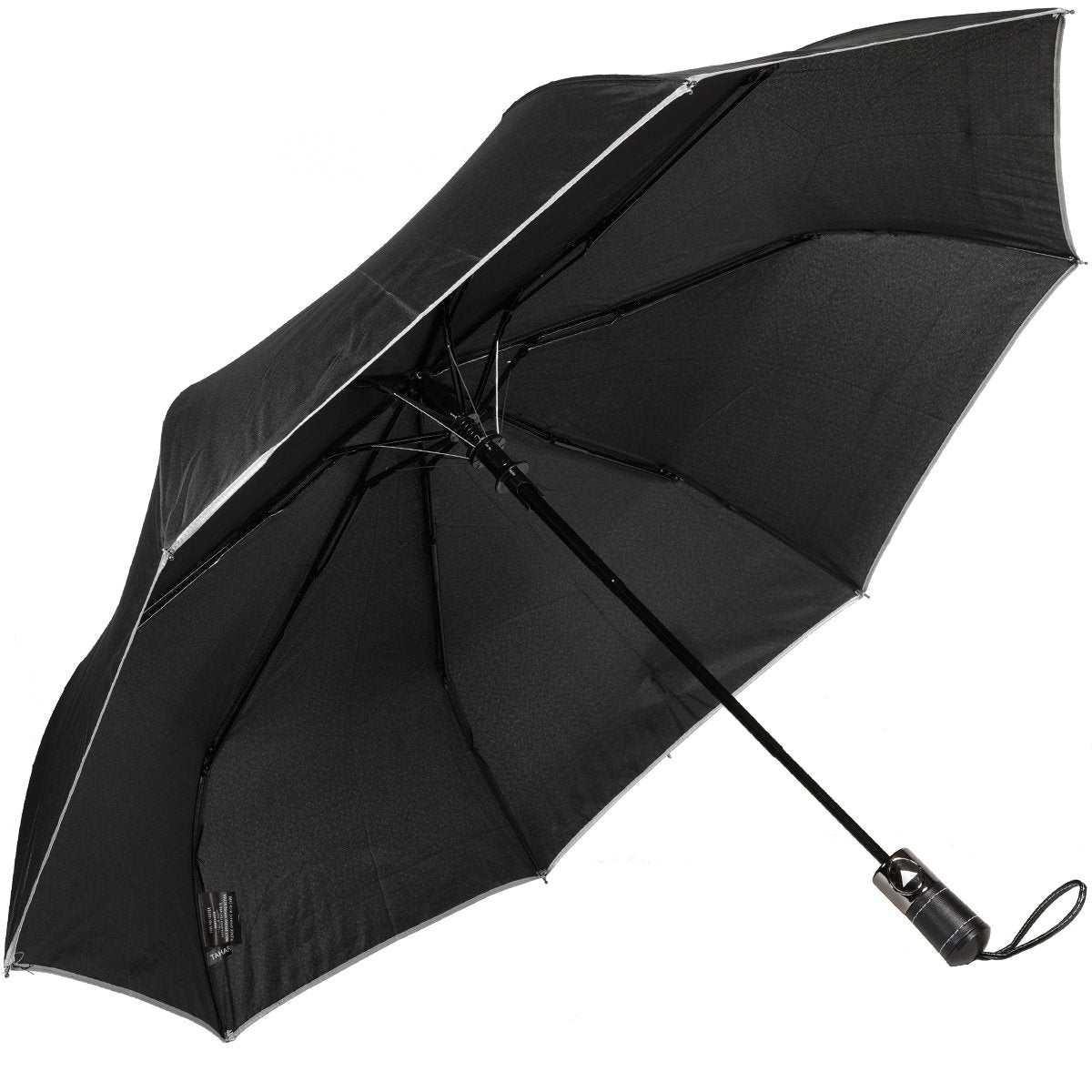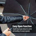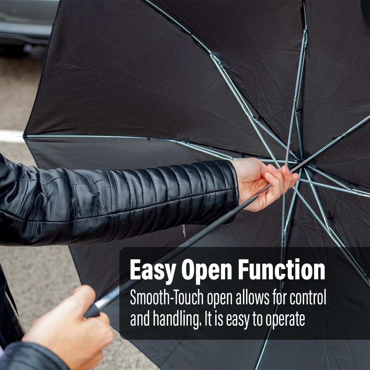 Rubberized handle design fits perfectly in your hand and is easy to grip. When not in use, the umbrella closes into a compact size that makes it perfect for travel.