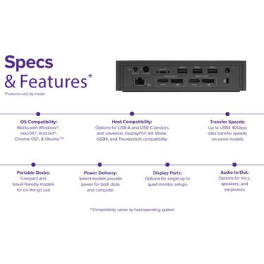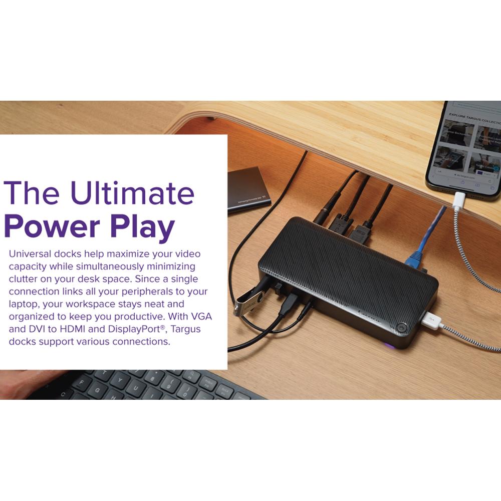 Designed for the modern workstation; the dock comes equipped with a VESA bracket mounting provision; which allows for use of the Targus VESA Mount Bracket (ACX003GLZ - sold separately) to hold your dock behind your display for even greater space savings.
