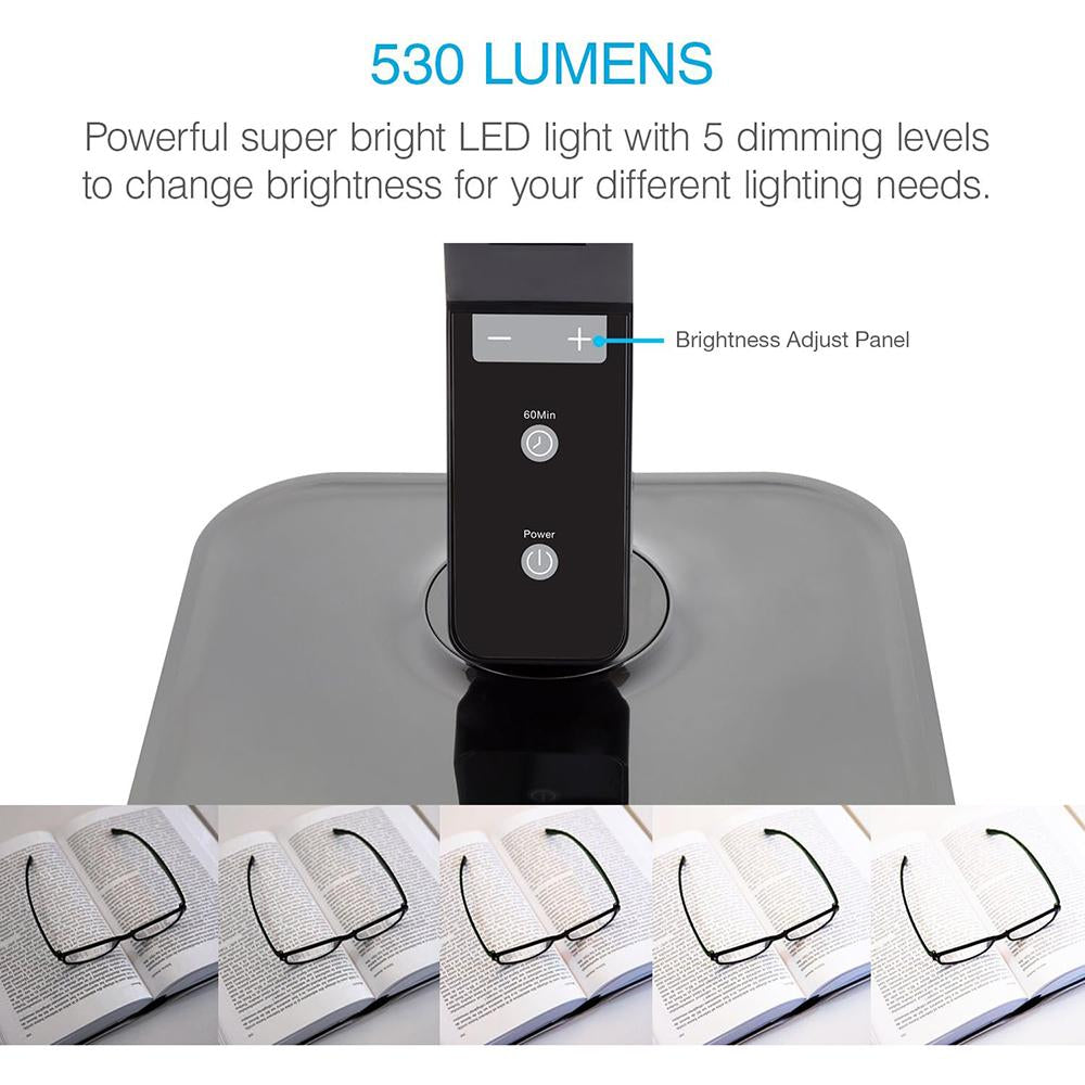 The Tenergy 7W Dimmable eye-care LED reading lamp offers a soothing non-flickering light that sets a comfortable atmosphere as you can enjoy a stress-free environment. 530 lumens, you can have a brightly lit workspace or office. With 5 dimming levels to choose from, you can go from full brightness to a softer light.