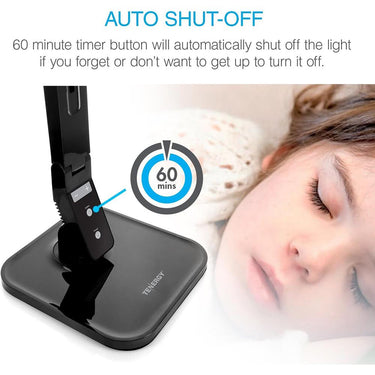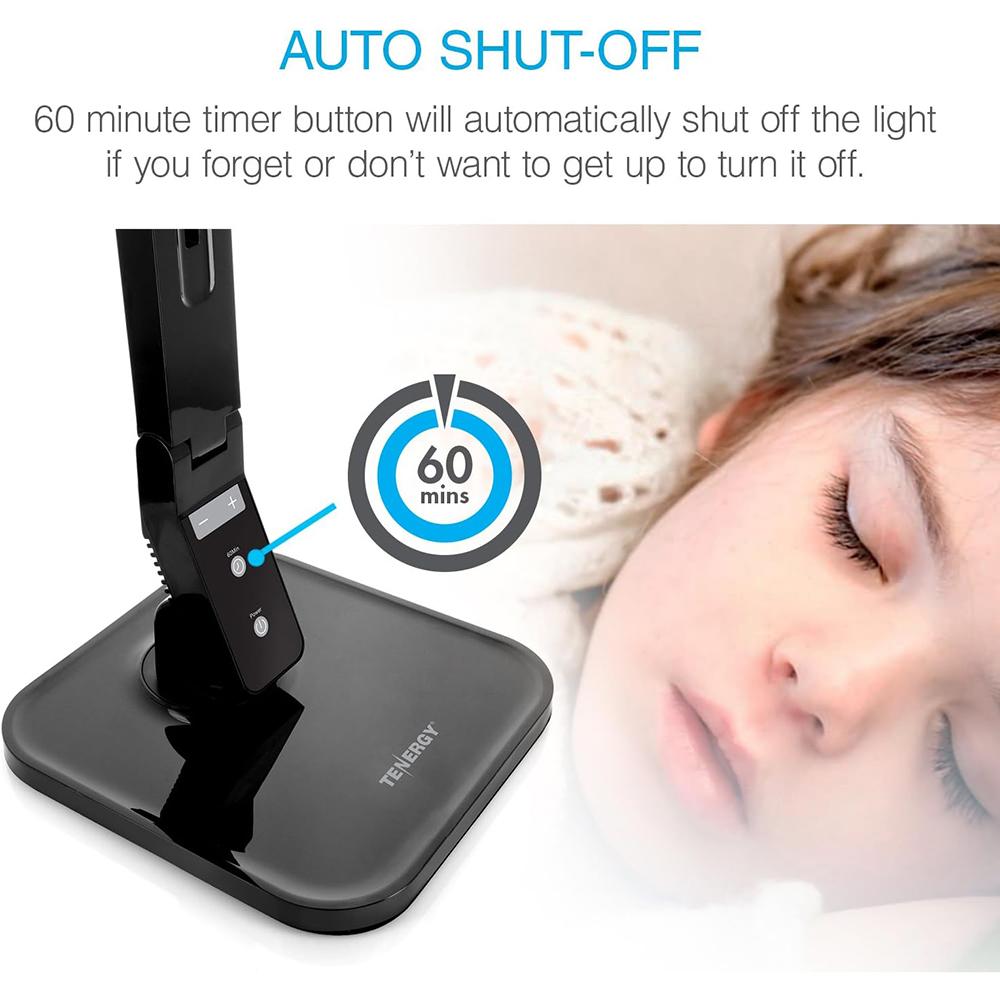 The touch control panel features a 60 minute timer button that automatically shuts off the desk lamp light so that you can conserve energy or sleep with the lights on. A sleek black finish with a polished gloss, this modern desk lamp features a foldable arm and swivel base to aim light in the direction you want.