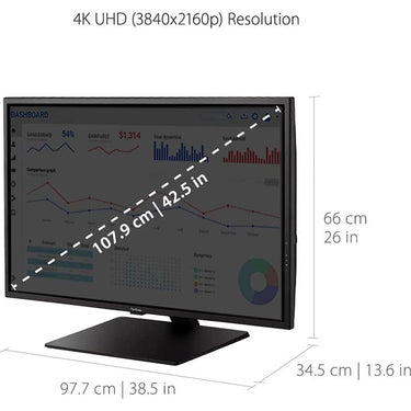 Designed with productivity in mind, the ViewSonic VX4381-4K combines incredible 4K resolution, a sleek narrow-bezel design, and an expansive 43" (42.5" viewable) screen so you can see all and do all from a single monitor. Featuring an MVA panel and 3840x2160 resolution, this monitor offers best-in-class screen performance with incredibly sharp and detailed visuals, while HDR10 content support delivers a high dynamic range of vivid color and contrast. Flexible and versatile for any office application ranging from document editing to graphic design, the VX4381-4K includes connectivity options such as DisplayPort 1.4, mini DisplayPort 1.4, DisplayPort Out, HDMI 2.0, and 3-USB ports. ViewSonic's MultiPicture functionality allows for efficient multitasking by providing simultaneous viewing of up to four split windows, while full ergonomic functionality delivers maximum comfort and enhanced productivity. With an energy-saving Eco-mode feature and ViewSonic's industry-leading 3-year limited warranty, this monitor is a solid long-term investment, delivering great power savings while boosting productivity for a variety of business applications.