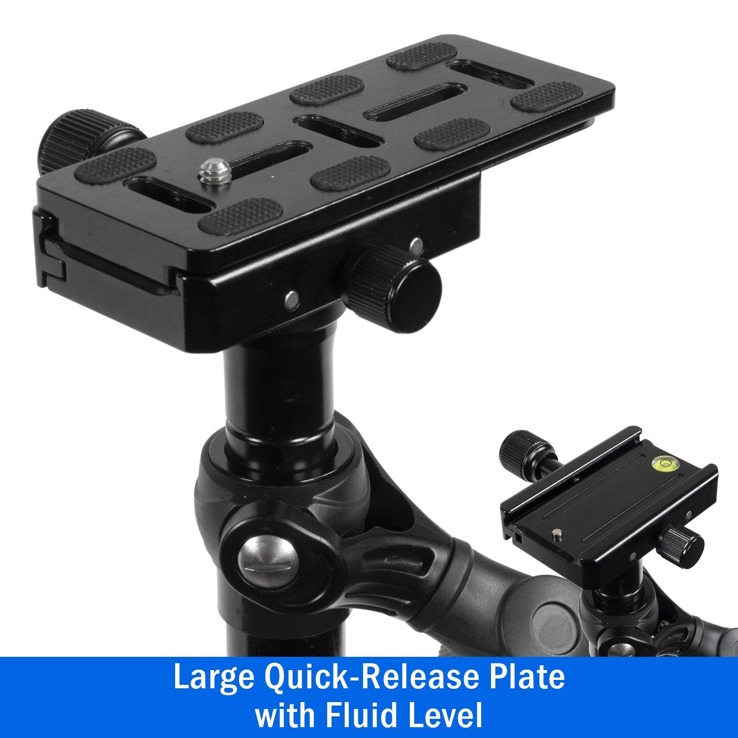 This stabilizer can be used with cameras and camcorders that have a standard tripod socket. It extends up to 59 inches, and can fold to 24 inches. The included carrying case allows for easy transport.